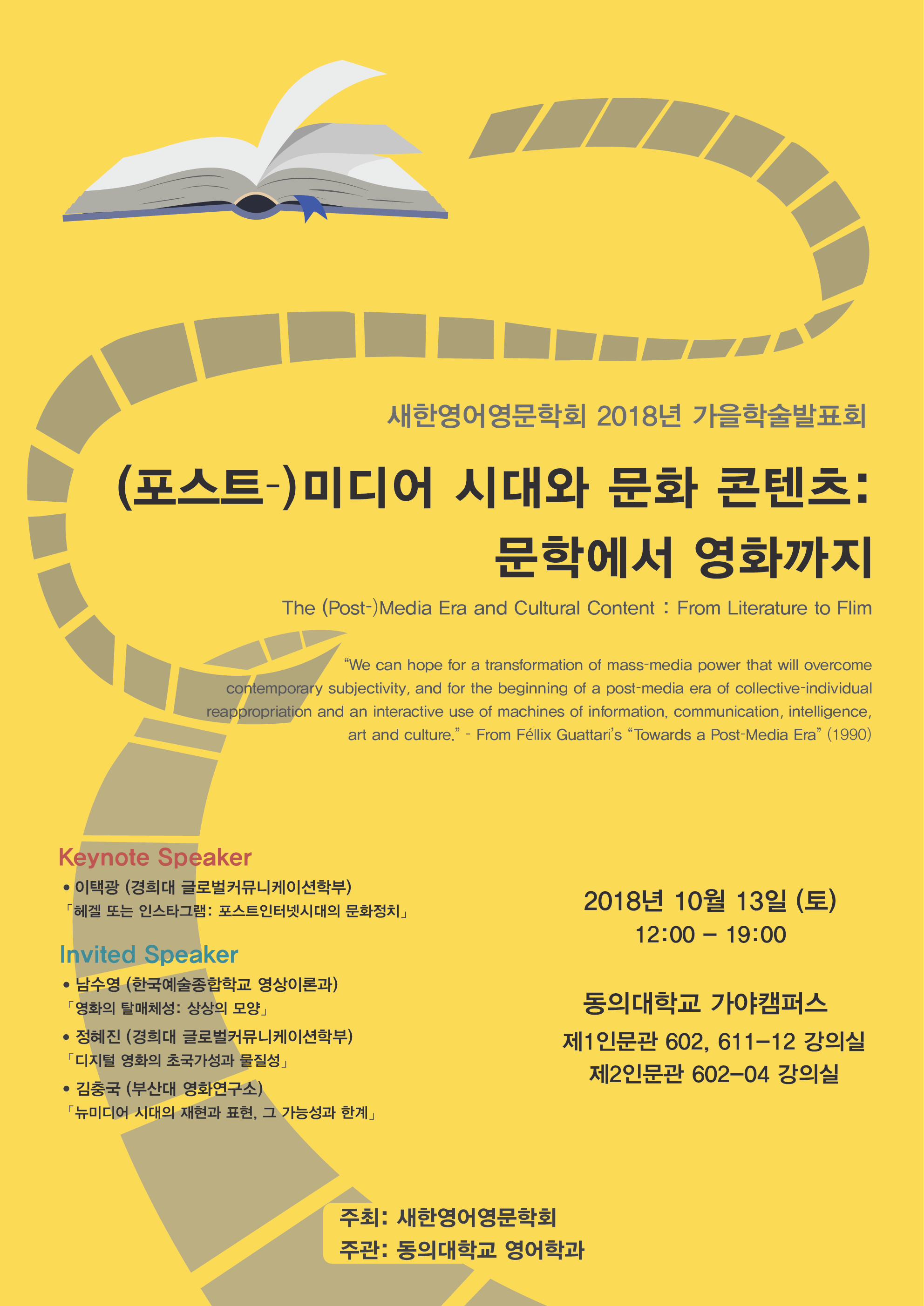 새한영어영문학회 가을학술발표회가 동의대학교에서 10월 13일 토요일에 개최됩니다.