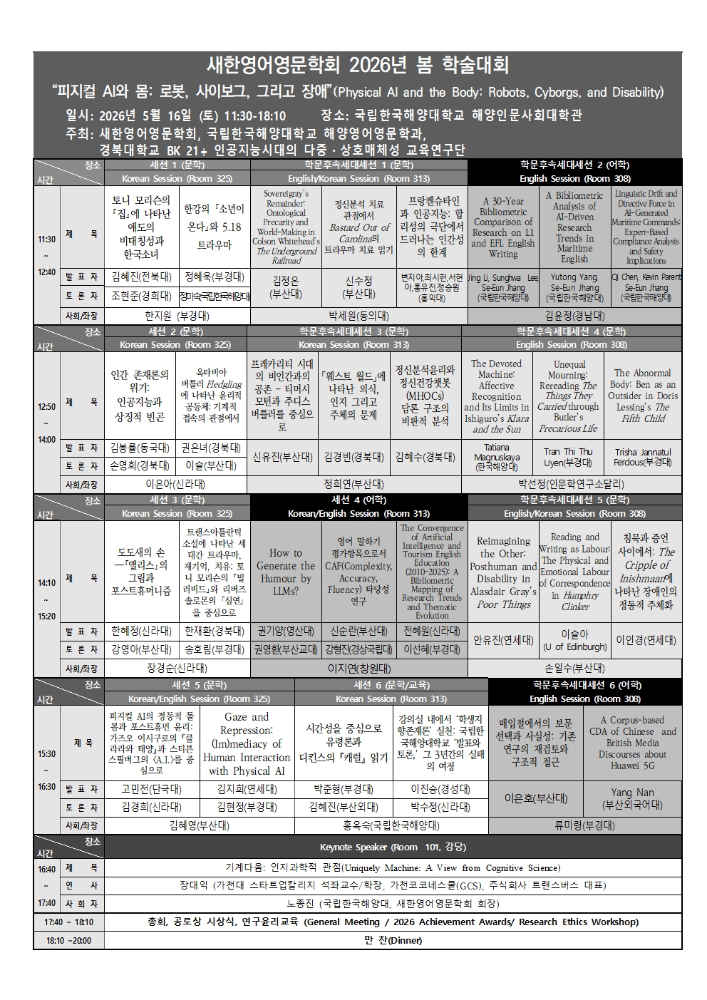The New Korean Association of English Language and Literature plans to host its 2026 spring conference entitled “Physical AI and the Body: Robots, Cyborgs, and Disability.” From prosthetic devices that replace parts of the human body to humanoids that share everyday life with us and perform complex human labor, AI is now increasingly operating not only in cyberspace but also in physical space. As an embodied intelligence that interacts with environments and carries out appropriate actions, physical AI challenges the human–machine binary at an unprecedented level. Through this conference, the New Korean Association of English Language and Literature seeks to explore the meaning of the “body” as a site where technology, organism, identity, and vulnerability intersect. We welcome research that asks what new understandings and attitudes toward the body the age of AI demands; how literature represents augmented, non-normative, or hybrid bodies; and how cyborg and disability theories reconsider the autonomy or interdependence of the human body. Focusing on literary studies while encouraging dialogue between fields such as (physical) AI, cyborg studies, robotics, and disability studies, this conference aims to create a space for rethinking the body in the age of technological entanglement and for reflecting on the meaning of humanity.